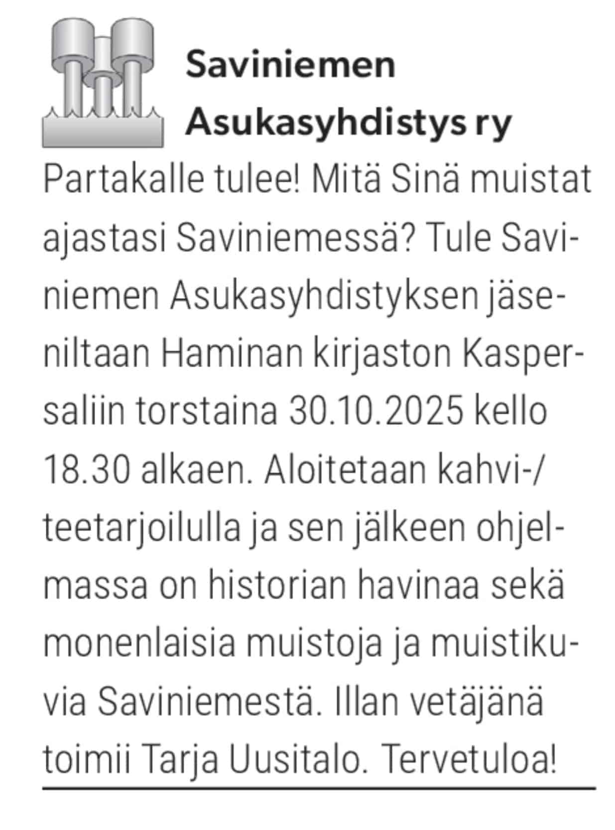 Tervetuloa kuuntelemaan ja keskustelemaan Saviniemen muistoista torstaina 30.10. Haminan kirjaston Kasper-saliin klo 18.30.