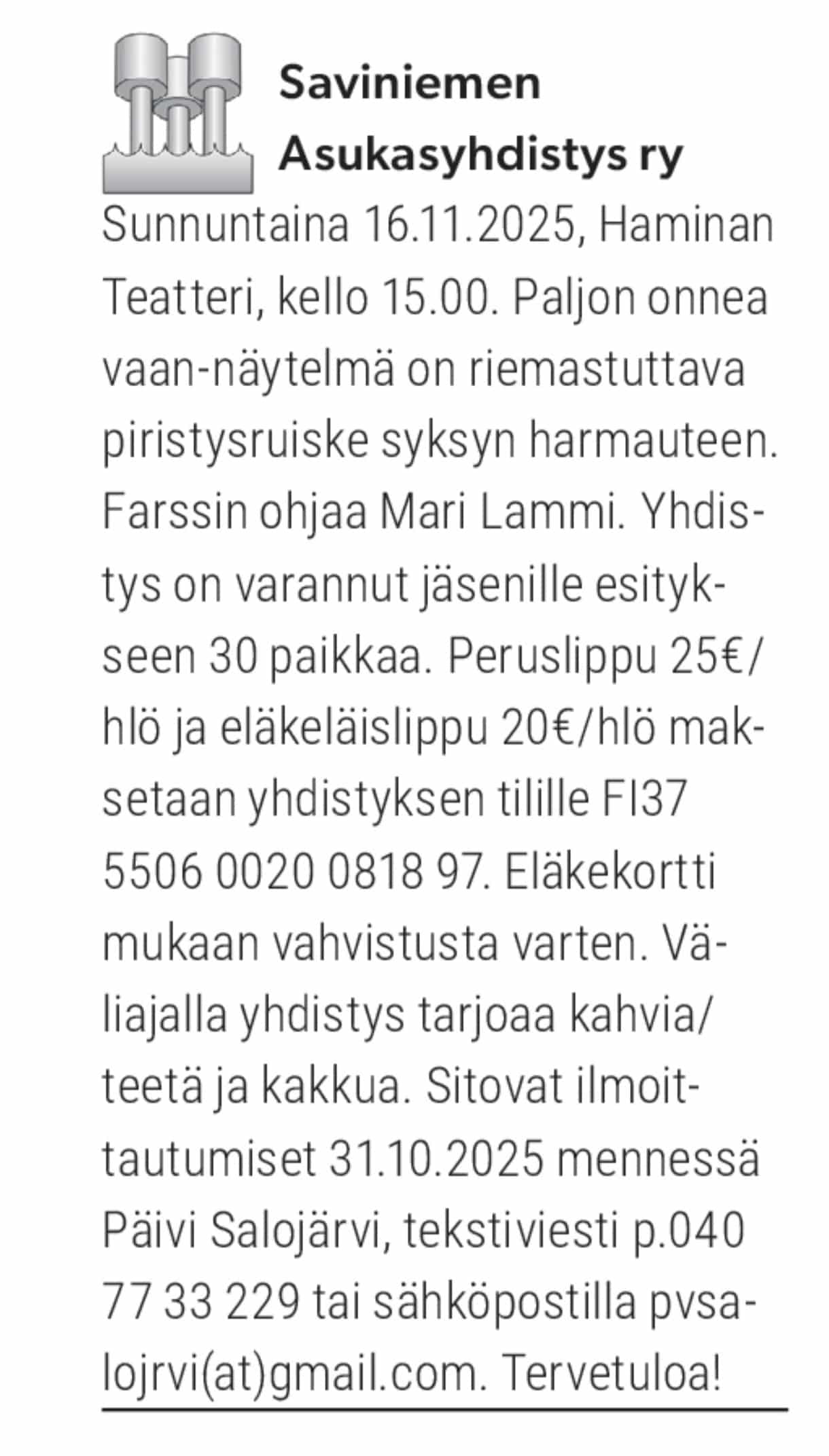 Asukasyhdistys järjestää myös perinteisen syksyn teatterin 16.11. klo 15.